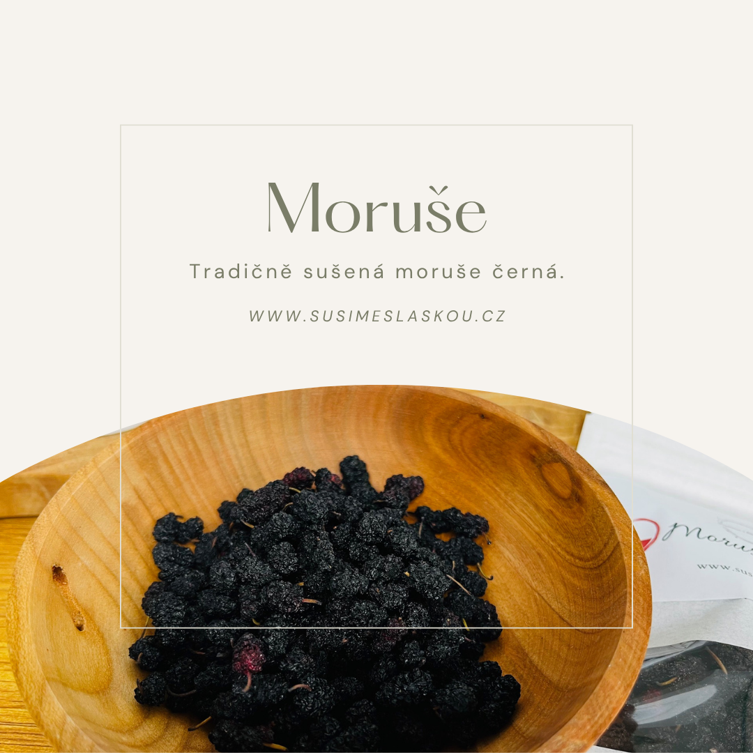 Poznejte rozdíl moruše, která vyrostla v českých zemích a byla tradičně usušena. Naše moruše nemusela urazit tisíce kilometrů, aby se dostala na váš stůl. Naše moruše vás dostane svým aroma i chutí. Náš tip: posnídejte jogurt s moruší a ovesnými vločkami.