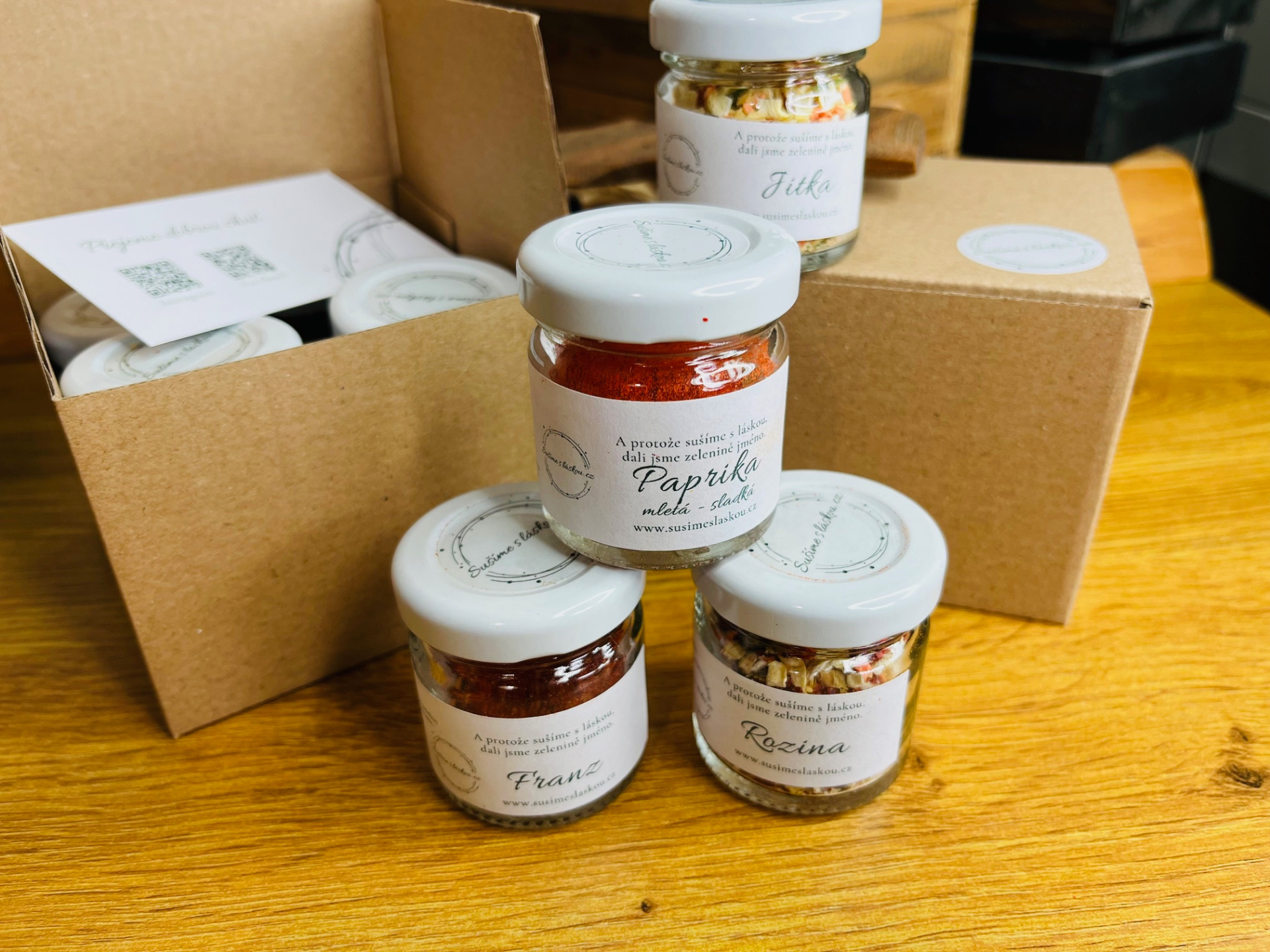 Jitka - mrkev, pastinák, česnek, petržel, cibule bílá, cibule sečka, celer nať. Franz - paprika, sůl hrubozrnná, pepř černý Mondolkiri, česnek, cibule, zázvor, citrónová tráva, kurkuma, koriandr nať. Rozina - hlíva ústřičná (20 %), paprika červená, sůl (Peru), petržel, celer, mrkev, pepř Mondolkiri (Kambodža), cibule, kmín, mateřídouška. Paprika mletá - sladká - 100% paprika sladká.