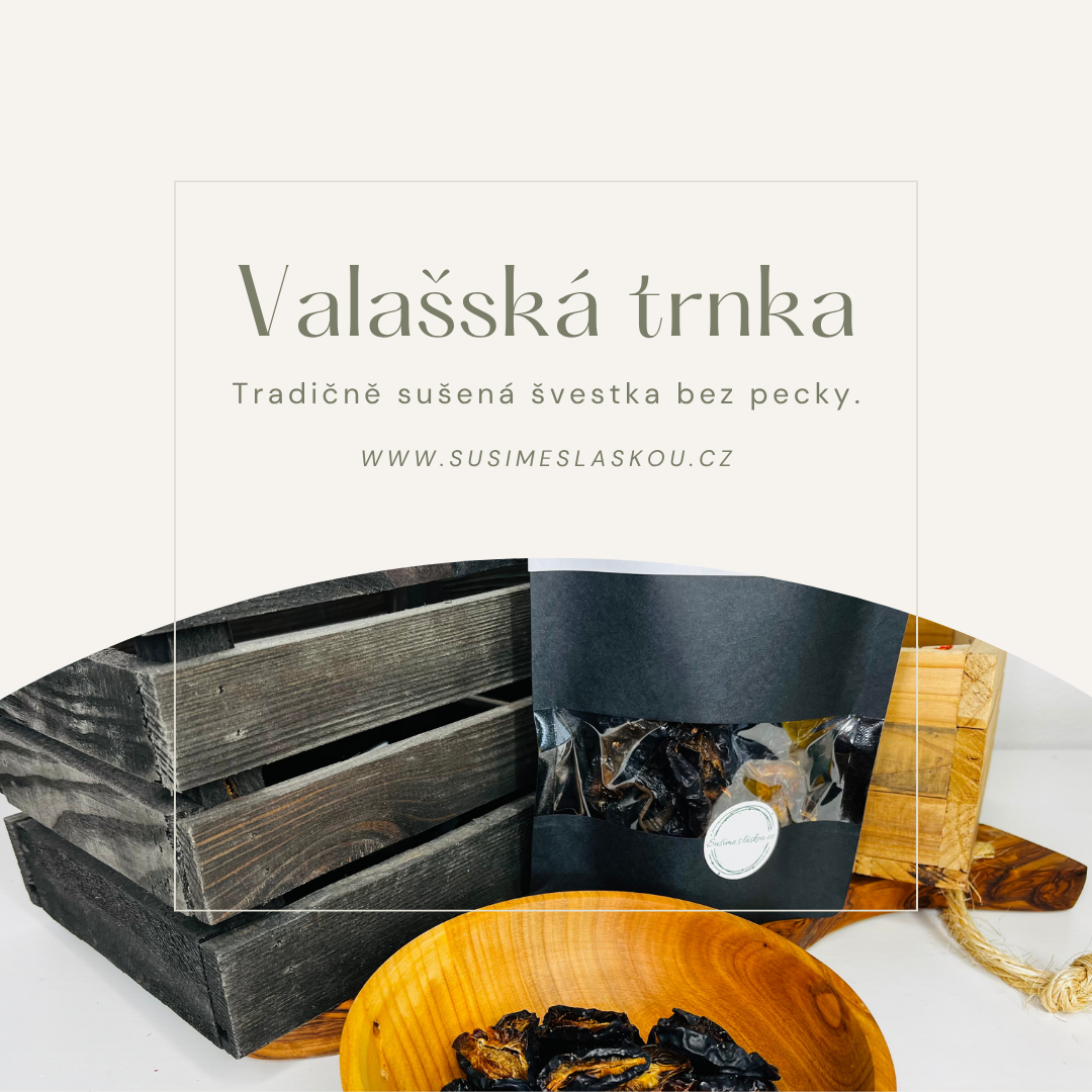 Švestkám, které rostou na Valašsku se říká trnky, sladké, šťavnaté, modré. Ty naše jsou poctivě usušené, tak jak mě to naučil děda s babičkou a bez pecek. To aby si zachovaly přirozeně lahodnou chuť, nevylámali jste si zuby a vždy si na nich pochutnali. Náš tip: zamíchejte do jáhlové nebo rýžové kaše, naučtě jíst děti krupici s trnkama sypanou perníkem.
